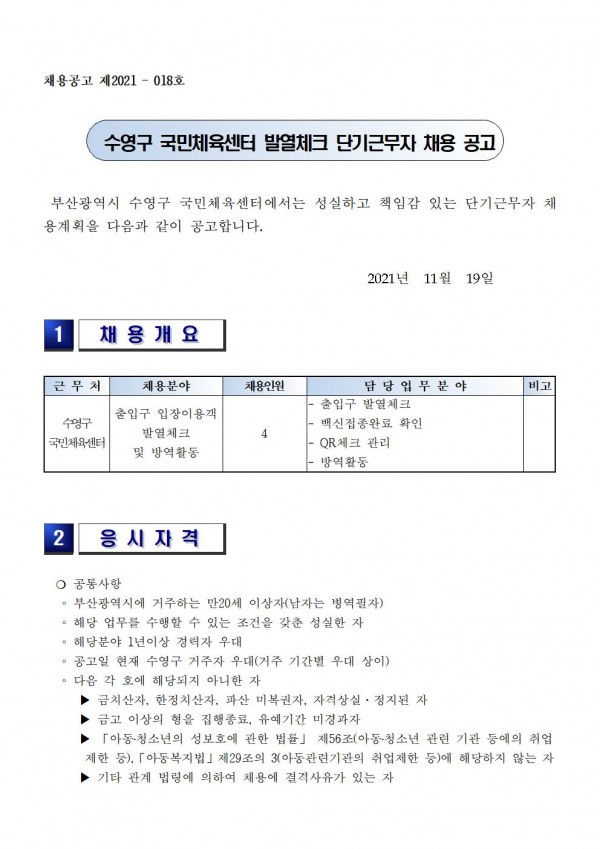 커뮤니케이션 센터소개 이용안내 프로그램안내 및 수강신청 대관신청 커뮤니케이션 마이페이지 채용공고 공지사항 묻고답하기 갤러리 채용공고 이달의일정 채용공고 ◎ 수영구 국민체육센터 코로나 방역 및 발열체크 단기근무자 채용 공고 관리자 0 863 0 0 Print 글주소 11-19 0 0 스크랩 신고 목록 이전글 다음글 정렬하기 날짜순 조회수 댓글수 추천순 제목+내용 제목 내용 회원명 회원아이디 번호 제목 이름 날짜 조회 공지 ◎ 수영구 국민체육센터 행정지원직원(남) 채용공고 관리자12-1242 관리자 12-12 42 공지 ◎ 수영구 국민체육센터 줌바댄스 지도자(강사) 채용공고 관리자12-05141 관리자 12-05 141 공지 ※성범죄 경력 및 아동학대관련범죄 전력 조회 동의서※ 관리자08-18218 관리자 08-18 218 141 ◎ 수영구 국민체육센터 행정지원직원(남) 채용공고 관리자12-1242 관리자 12-12 42 140 ◎ 수영구 국민체육센터 줌바댄스 지도자(강사) 채용공고 Hot 관리자12-05141 관리자 12-05 141 139 ◎ 수영구 국민체육센터 안내데스크 채용공고 Hot 관리자12-03180 관리자 12-03 180 138 ◎ 수영구 국민체육센터 새벽 필라테스 지도자(강사) 채용 공고 Hot 관리자11-28113 관리자 11-28 113 137 ◎ 수영구 국민체육센터 수영장 주말파트강사 채용 공고 관리자10-2493 관리자 10-24 93 136 ※성범죄 경력 및 아동학대관련범죄 전력 조회 동의서※ 관리자08-18218 관리자 08-18 218 135 ◎ 수영구 국민체육센터 수영장 주말안전요원 채용 공고 관리자07-15284 관리자 07-15 284 134 ◎ 수영구 국민체육센터 수영장 오후안전요원 채용 공고 관리자07-15226 관리자 07-15 226 133 ◎ 수영구 국민체육센터 단기 안내직 채용공고 관리자05-16478 관리자 05-16 478 132 ◎ 수영구 국민체육센터 수영장 저녁파트강사 및 주말안전요원 채용 공고 관리자02-25458 관리자 02-25 458 131 ◎ 수영구 국민체육센터 수영장 오후안전요원 채용 공고 관리자01-15332 관리자 01-15 332 130 ◎ 수영구 국민체육센터 수영장 정직원 및 파트강사 채용 공고 관리자12-13542 관리자 12-13 542 129 ◎ 수영구 국민체육센터 헬스근무자(오전파트) 채용공고 관리자12-11504 관리자 12-11 504 128 ◎ 수영구 국민체육센터 안내데스크 채용공고 관리자10-07772 관리자 10-07 772 127 ◎ 수영구 국민체육센터 안내데스크 채용공고 관리자09-25441 관리자 09-25 441 126 ◎ 수영구 국민체육센터 단기(3개월) 미화원 채용공고 관리자09-23426 관리자 09-23 426 125 ◎ 수영구 국민체육센터 안내데스크 채용공고 관리자09-12464 관리자 09-12 464 124 ◎ 수영구 국민체육센터 줌바댄스 지도자(강사) 채용공고 관리자09-09483 관리자 09-09 483 123 ◎ 수영구 국민체육센터 운영지원 채용공고 관리자08-27642 관리자 08-27 642 122 ◎ 수영구 국민체육센터 새벽 필라테스 지도자(강사) 채용 공고 관리자08-21698 관리자 08-21 698 목록 123456>맨끝 ›