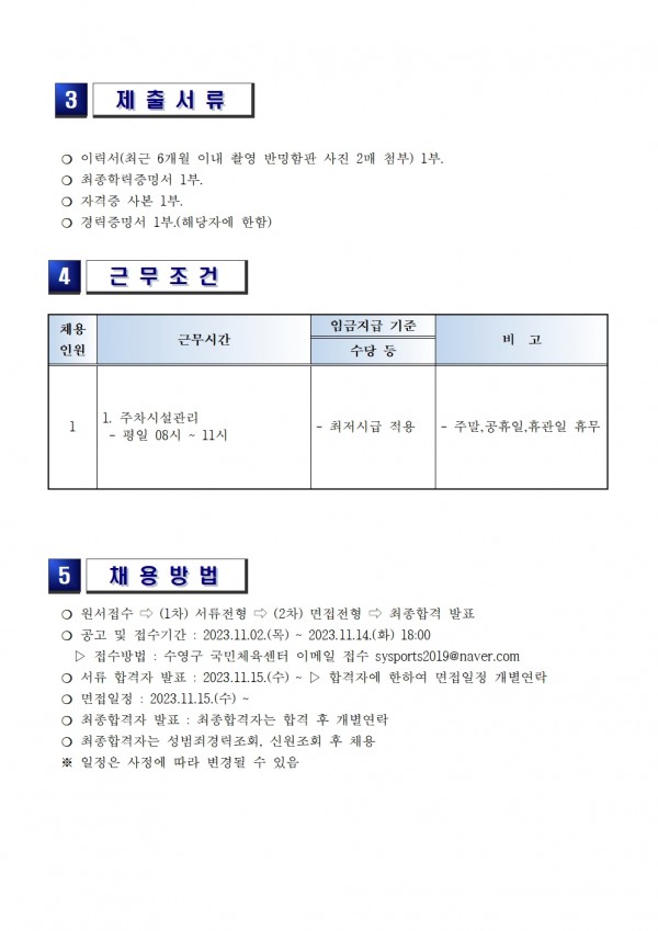 커뮤니케이션 센터소개 이용안내 프로그램안내 및 수강신청 대관신청 커뮤니케이션 마이페이지 채용공고 공지사항 묻고답하기 갤러리 채용공고 이달의일정 채용공고 ◎ 수영구 국민체육센터 단기 주차관리근무자 채용 공고 관리자 0 680 0 0 Print 글주소 11-02 0 0 스크랩 신고 목록 이전글 다음글 정렬하기 날짜순 조회수 댓글수 추천순 제목+내용 제목 내용 회원명 회원아이디 번호 제목 이름 날짜 조회 공지 ◎ 수영구 국민체육센터 행정지원직원(남) 채용공고 관리자12-1261 관리자 12-12 61 공지 ◎ 수영구 국민체육센터 줌바댄스 지도자(강사) 채용공고 관리자12-05148 관리자 12-05 148 공지 ※성범죄 경력 및 아동학대관련범죄 전력 조회 동의서※ 관리자08-18221 관리자 08-18 221 121 ◎ 수영구 국민체육센터 안내데스크 채용공고 관리자08-08544 관리자 08-08 544 120 ◎ 수영구 국민체육센터 운영지원 채용공고 관리자08-08565 관리자 08-08 565 119 ◎ 수영구 국민체육센터 안내데스크 채용공고 관리자07-23568 관리자 07-23 568 118 ◎ 수영구 국민체육센터 안내데스크 채용공고 관리자07-03633 관리자 07-03 633 117 ◎ 수영구 국민체육센터 안내데스크 채용공고 관리자06-18631 관리자 06-18 631 116 ◎ 수영구 국민체육센터 수영장 파트강사(19시,20시,21시) 채용 공고 관리자06-10674 관리자 06-10 674 115 ◎ 수영구 국민체육센터 안내데스크 채용 공고 관리자06-05607 관리자 06-05 607 114 ◎ 수영구 국민체육센터 수영장안전요원 채용 공고 관리자04-15775 관리자 04-15 775 113 ◎ 수영구 국민체육센터 어린이 풋살 강사 채용 공고 관리자04-01549 관리자 04-01 549 112 ◎ 수영구 국민체육센터 주차관리 및 외부미화 직원 채용 공고 관리자03-18714 관리자 03-18 714 111 ◎ 수영구 국민체육센터 주말 수영장 파트강사 채용 공고 관리자03-06700 관리자 03-06 700 110 ◎ 수영구 국민체육센터 수영장 파트강사(오후) 채용 공고 관리자02-13674 관리자 02-13 674 109 ◎ 수영구 국민체육센터 수영정직원 채용 공고 관리자02-13886 관리자 02-13 886 108 ◎ 수영구 국민체육센터 수영장 안전요원(오후) 채용 공고 관리자01-19782 관리자 01-19 782 107 ◎ 수영구 국민체육센터 운영지원 채용공고 관리자01-12900 관리자 01-12 900 106 ◎ 수영구 국민체육센터 수영장 주말 파트강사 채용 공고 관리자12-29660 관리자 12-29 660 105 ◎ 수영구 국민체육센터 어린이농구 (월.수 15시,16시,17시) 공고 관리자12-28581 관리자 12-28 581 104 ◎ 수영구 국민체육센터 단기(6개월) 헬스지도자 채용 공고 관리자12-18724 관리자 12-18 724 103 ◎ 수영구 국민체육센터 배드민턴 지도자 채용 공고 관리자11-08608 관리자 11-08 608 102 ◎ 수영구 국민체육센터 단기 주차관리근무자 채용 공고 관리자11-02681 관리자 11-02 681 목록 <1234567>맨끝 ›