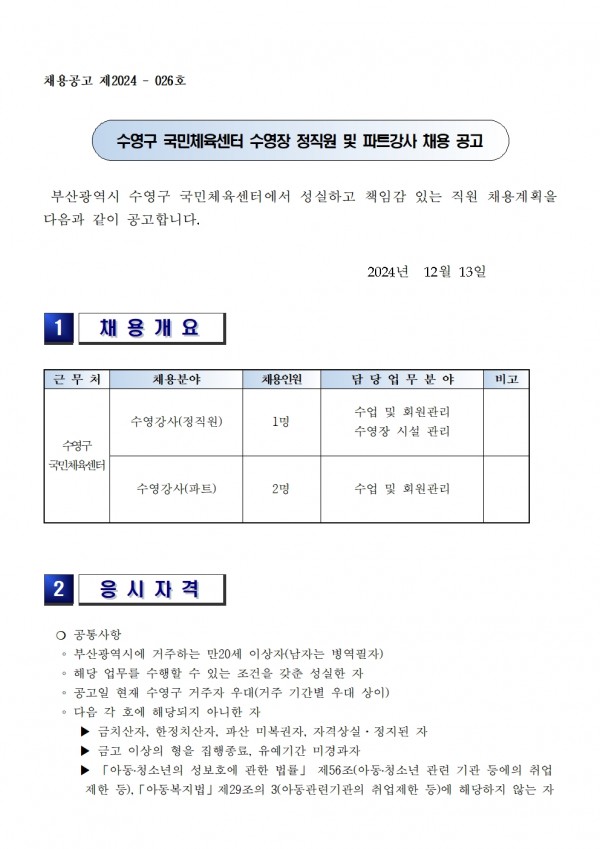커뮤니케이션 센터소개 이용안내 프로그램안내 및 수강신청 대관신청 커뮤니케이션 마이페이지 채용공고 공지사항 묻고답하기 갤러리 채용공고 이달의일정 채용공고 ◎ 수영구 국민체육센터 수영장 정직원 및 파트강사 채용 공고 관리자 0 542 0 0 Print 글주소 12-13 0 0 스크랩 신고 목록 이전글 다음글 정렬하기 날짜순 조회수 댓글수 추천순 제목+내용 제목 내용 회원명 회원아이디 번호 제목 이름 날짜 조회 공지 ◎ 수영구 국민체육센터 행정지원직원(남) 채용공고 관리자12-1249 관리자 12-12 49 공지 ◎ 수영구 국민체육센터 줌바댄스 지도자(강사) 채용공고 관리자12-05145 관리자 12-05 145 공지 ※성범죄 경력 및 아동학대관련범죄 전력 조회 동의서※ 관리자08-18220 관리자 08-18 220 141 ◎ 수영구 국민체육센터 행정지원직원(남) 채용공고 관리자12-1249 관리자 12-12 49 140 ◎ 수영구 국민체육센터 줌바댄스 지도자(강사) 채용공고 Hot 관리자12-05145 관리자 12-05 145 139 ◎ 수영구 국민체육센터 안내데스크 채용공고 Hot 관리자12-03183 관리자 12-03 183 138 ◎ 수영구 국민체육센터 새벽 필라테스 지도자(강사) 채용 공고 Hot 관리자11-28114 관리자 11-28 114 137 ◎ 수영구 국민체육센터 수영장 주말파트강사 채용 공고 관리자10-2494 관리자 10-24 94 136 ※성범죄 경력 및 아동학대관련범죄 전력 조회 동의서※ 관리자08-18220 관리자 08-18 220 135 ◎ 수영구 국민체육센터 수영장 주말안전요원 채용 공고 관리자07-15286 관리자 07-15 286 134 ◎ 수영구 국민체육센터 수영장 오후안전요원 채용 공고 관리자07-15227 관리자 07-15 227 133 ◎ 수영구 국민체육센터 단기 안내직 채용공고 관리자05-16479 관리자 05-16 479 132 ◎ 수영구 국민체육센터 수영장 저녁파트강사 및 주말안전요원 채용 공고 관리자02-25459 관리자 02-25 459 131 ◎ 수영구 국민체육센터 수영장 오후안전요원 채용 공고 관리자01-15332 관리자 01-15 332 130 ◎ 수영구 국민체육센터 수영장 정직원 및 파트강사 채용 공고 관리자12-13543 관리자 12-13 543 129 ◎ 수영구 국민체육센터 헬스근무자(오전파트) 채용공고 관리자12-11504 관리자 12-11 504 128 ◎ 수영구 국민체육센터 안내데스크 채용공고 관리자10-07773 관리자 10-07 773 127 ◎ 수영구 국민체육센터 안내데스크 채용공고 관리자09-25441 관리자 09-25 441 126 ◎ 수영구 국민체육센터 단기(3개월) 미화원 채용공고 관리자09-23427 관리자 09-23 427 125 ◎ 수영구 국민체육센터 안내데스크 채용공고 관리자09-12464 관리자 09-12 464 124 ◎ 수영구 국민체육센터 줌바댄스 지도자(강사) 채용공고 관리자09-09483 관리자 09-09 483 123 ◎ 수영구 국민체육센터 운영지원 채용공고 관리자08-27642 관리자 08-27 642 122 ◎ 수영구 국민체육센터 새벽 필라테스 지도자(강사) 채용 공고 관리자08-21698 관리자 08-21 698 목록 123456>맨끝 ›
